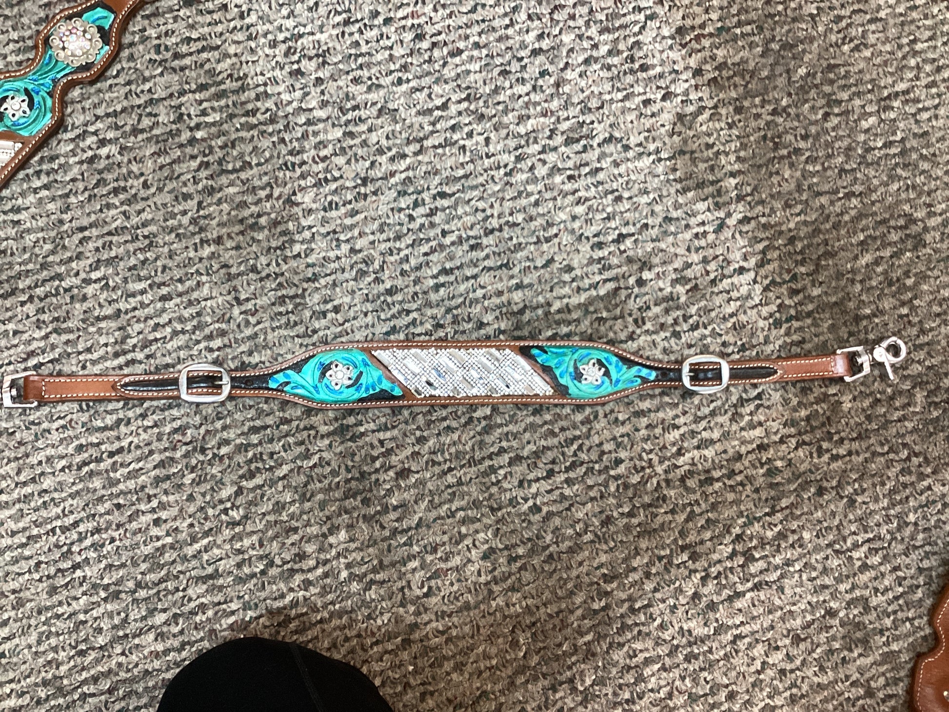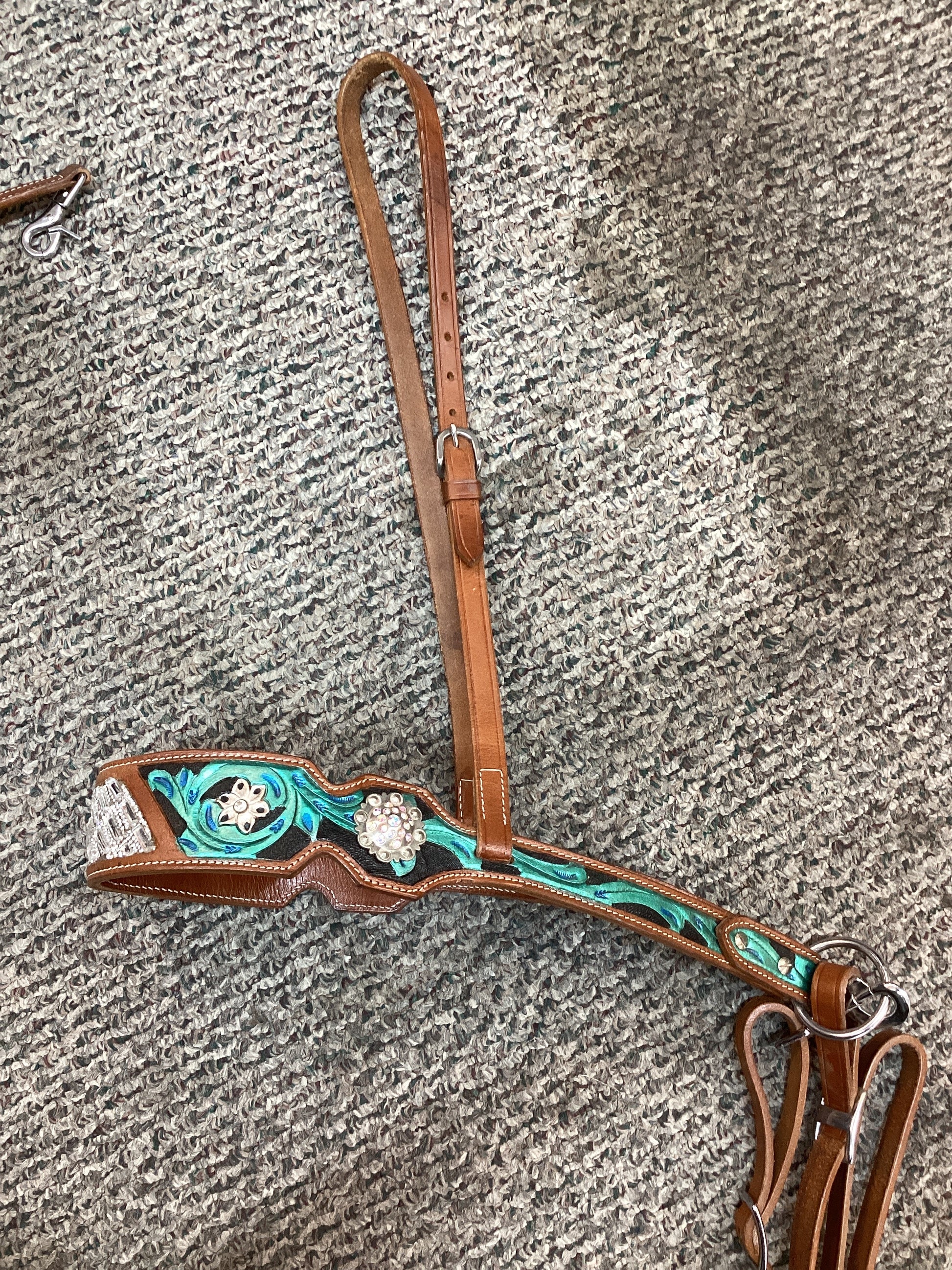 Turning heads and chasing dreams. The Ashton Tack Set is show stopper that is going to shine in the big lights! Metallic turquoise and blue painted tooling with rhinestone accents.