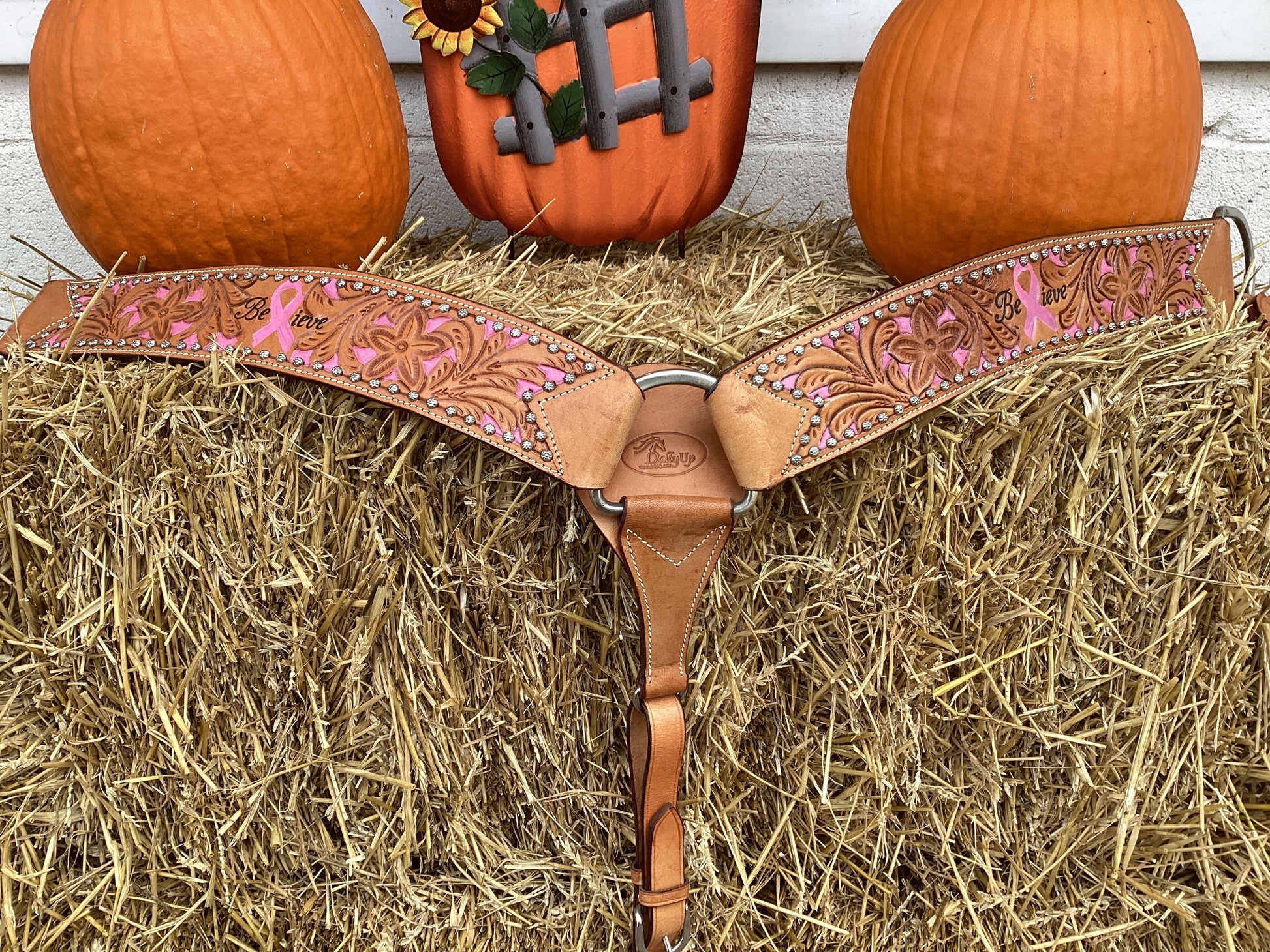 Set includes Browband Bridle and Breastcollar in a light oil. Floral Tooling with pink painted background, pink ribbon and “Believe”.