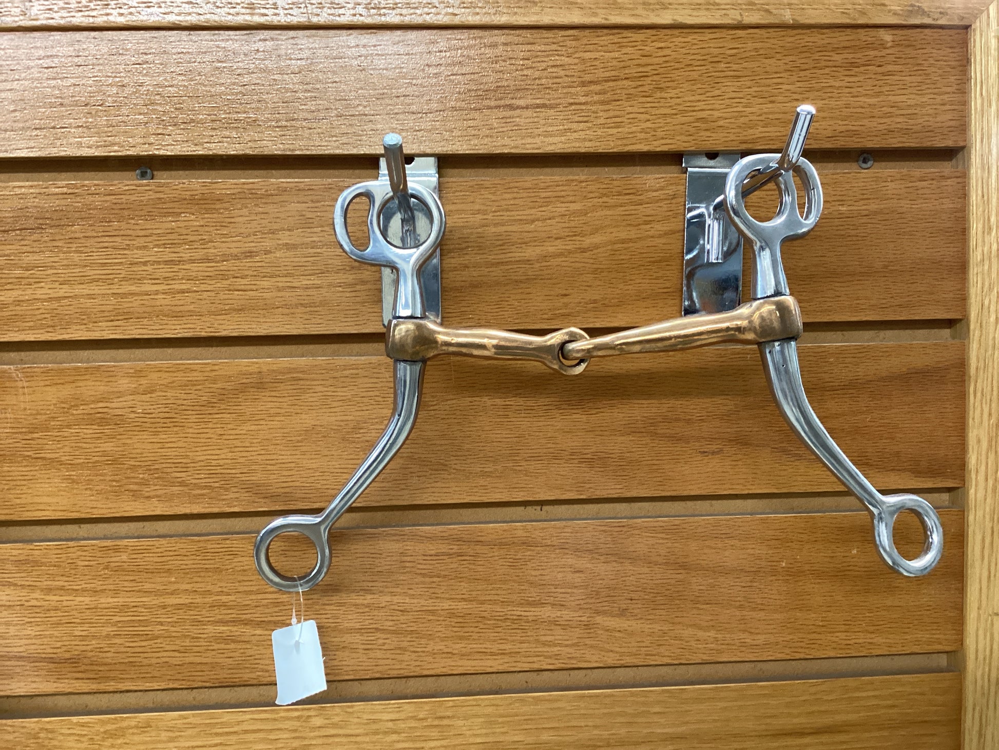 This is a copper and stainless steel mix jointed snaffle bit that sits on a curved shank. 5”