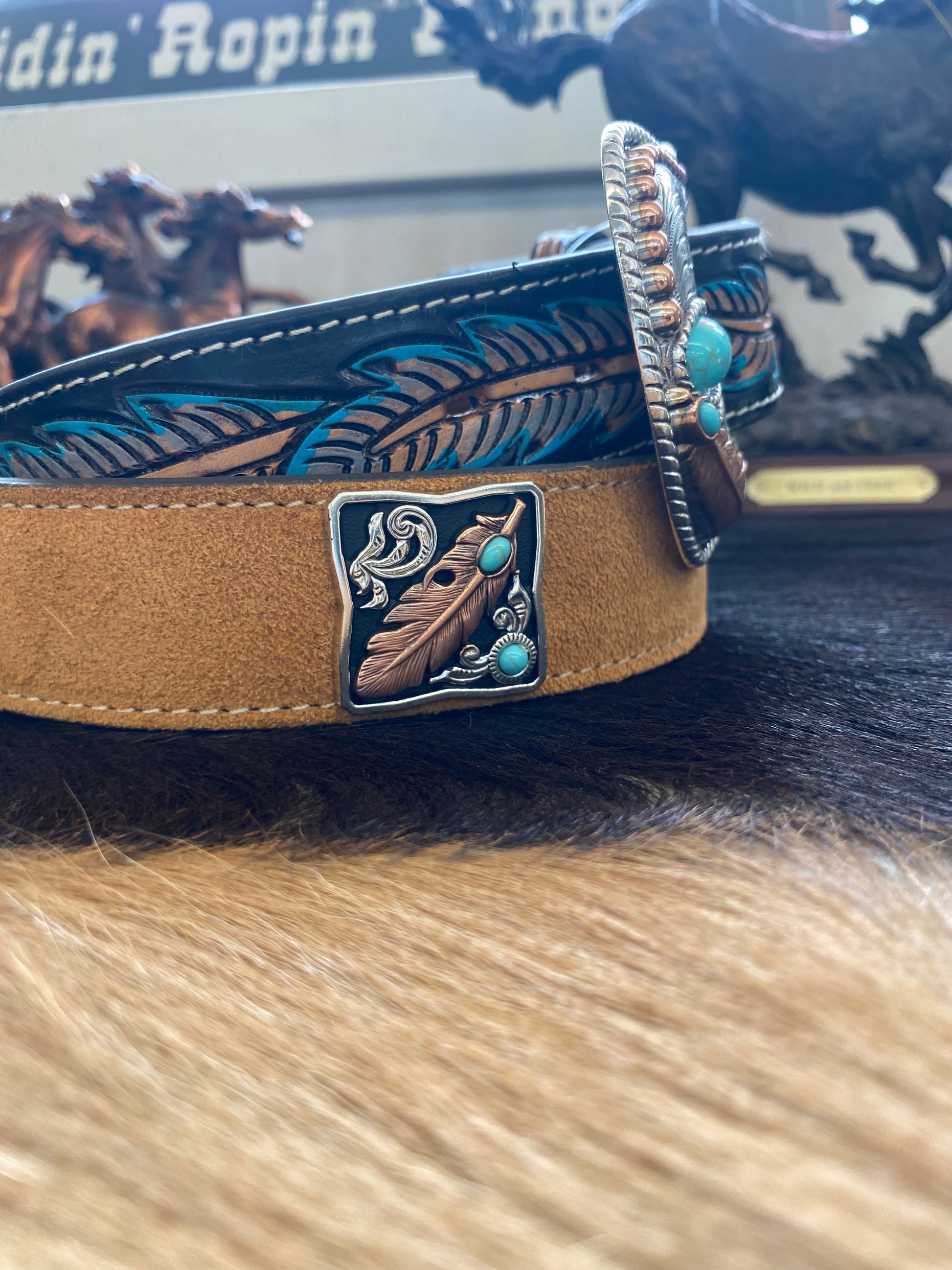 Talk about gorgeous! This rough-out and hand tooled belt is simple yet stylish with beautiful copper and silver conchos and turquoise. Comes with removable belt buckle that matches the conchos.
