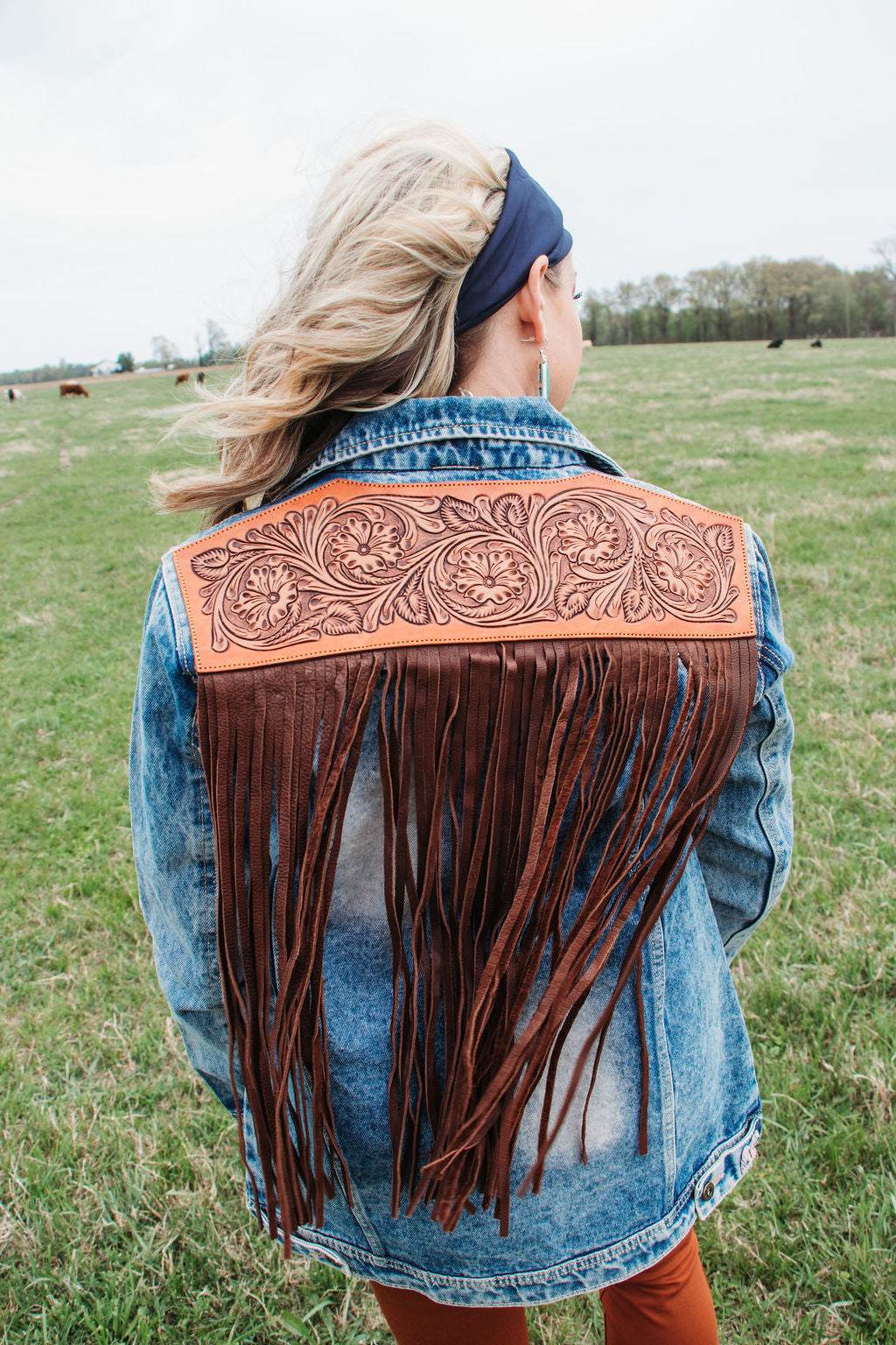 American Darling took the basic denim jacket and made it EPIC! Beautiful floral detailing on the back yoke and fringe.