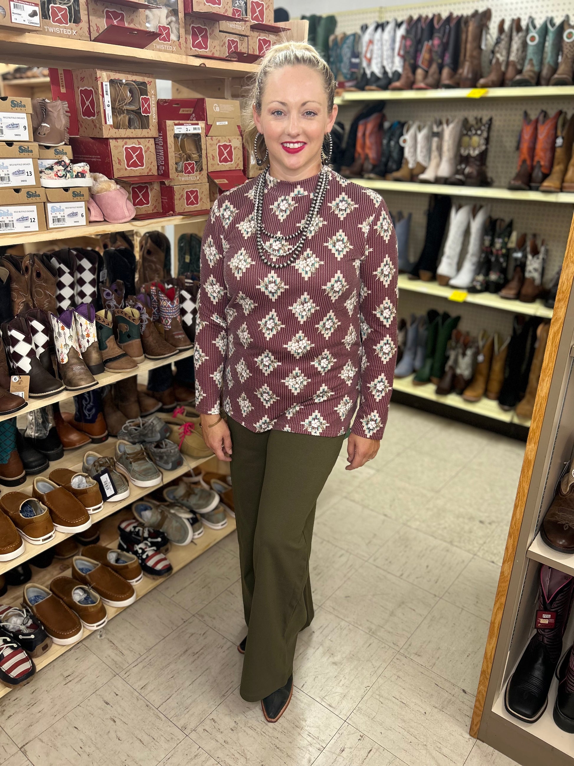 Embrace bold style with the High Plains Aztec Top, featuring a rich cranberry ribbed fabric that offers both comfort and a flattering fit. The striking Aztec design centers around a delicate cotton plant motif, adding a unique, nature-inspired touch. Perfect for layering or wearing on its own, this long sleeve top combines cultural flair with everyday versatility to elevate your wardrobe effortlessly.