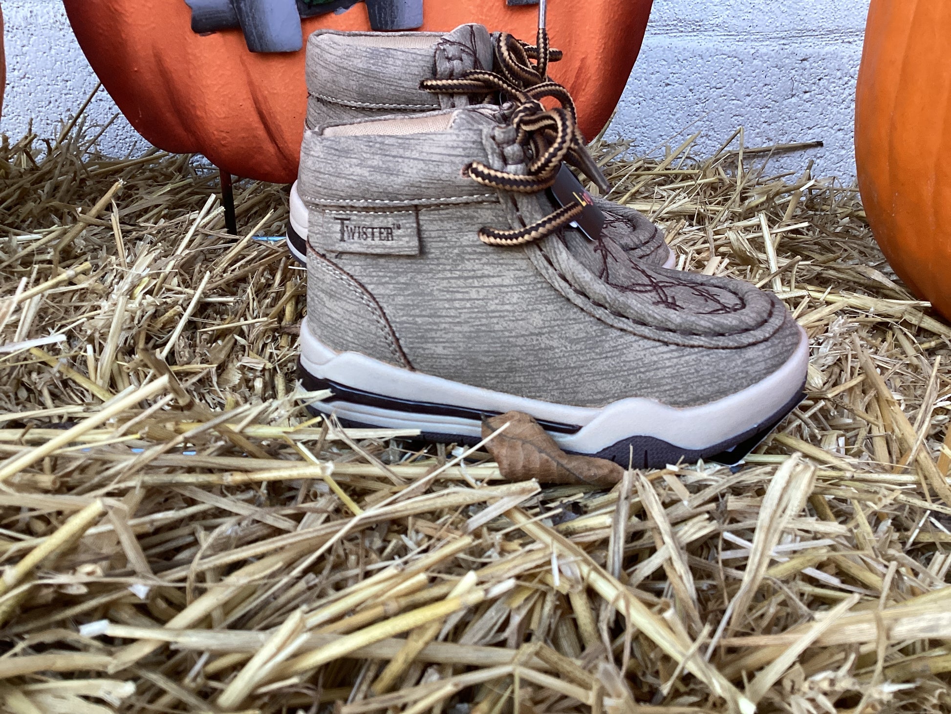 The Jackson Toddle Casual by Twister features barbed wire embroidery, non-slip soles, and a high ankle with support for those early days of walking.