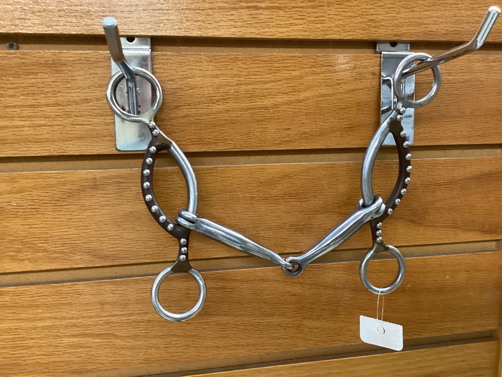 Stainless steel jointed mouthpiece with sweet iron cheeks. Loose shank with rings. Good solid bit.