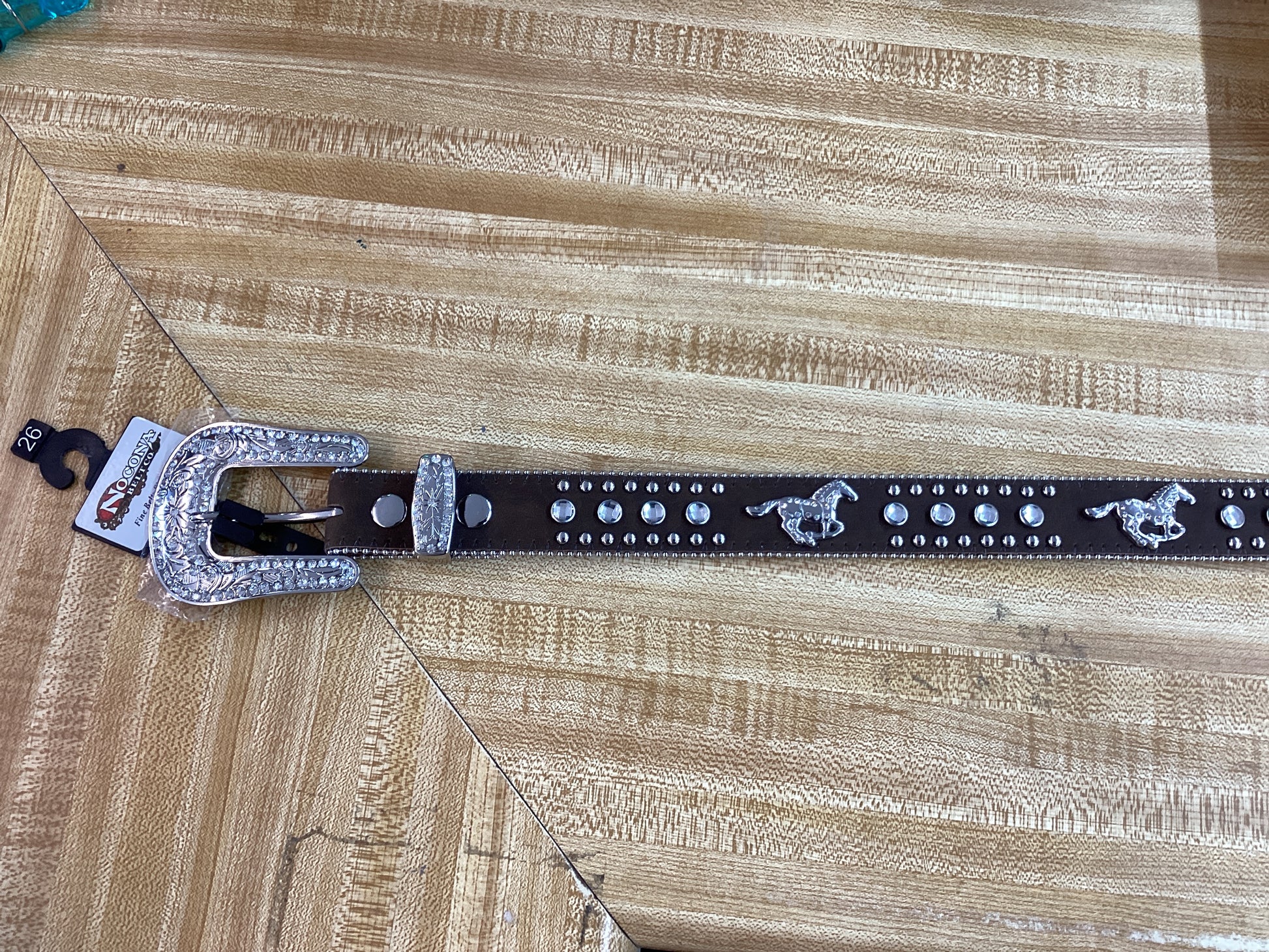 Brown leather belt with running horse and rhinestone details. Removable buckle has just enough rhinestones to make your cowgirl sparkle.