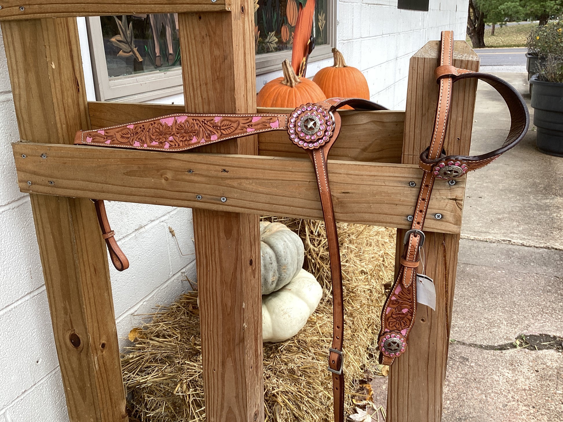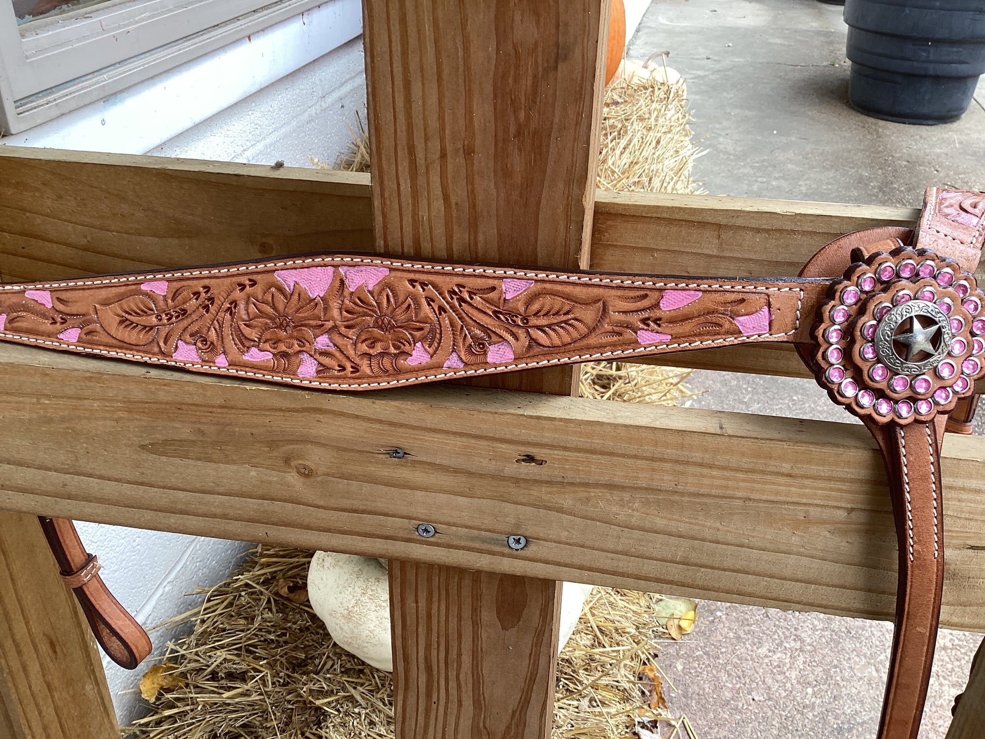 Beautiful light oil tack set with floral tooling, painted pink background, pink rhinestones and Texas Star Conchos.