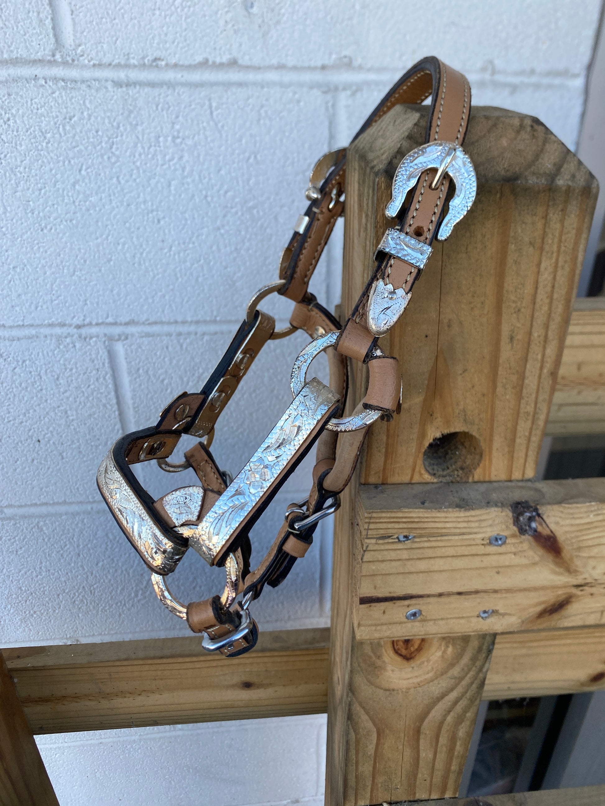 Draw the judge’s eye to your horse with this dark oil show halter. Made of doubled leather and expertly stitched for strength. Handsome engraved silver plates adorn the nose and cheeks, but the shine doesn’t stop there. This halter also has matching engraved silver rings, buckles, tips, and keepers. The 5-way buckle adjustments mean a more custom fit for your horse. Includes 5-foot leather lead.