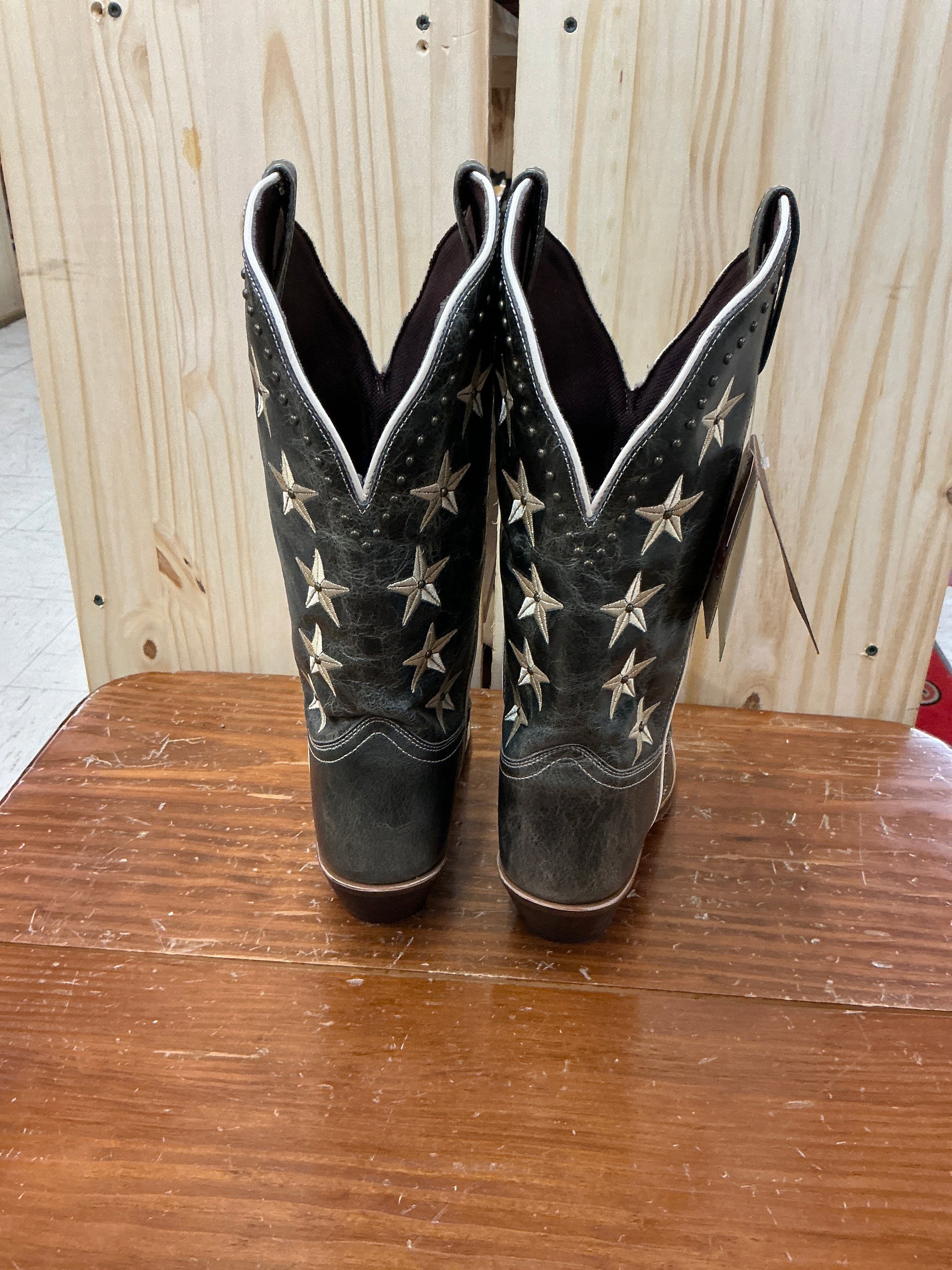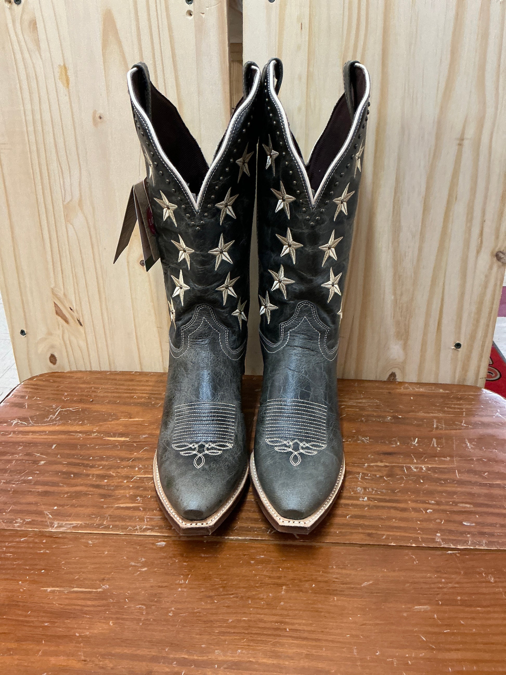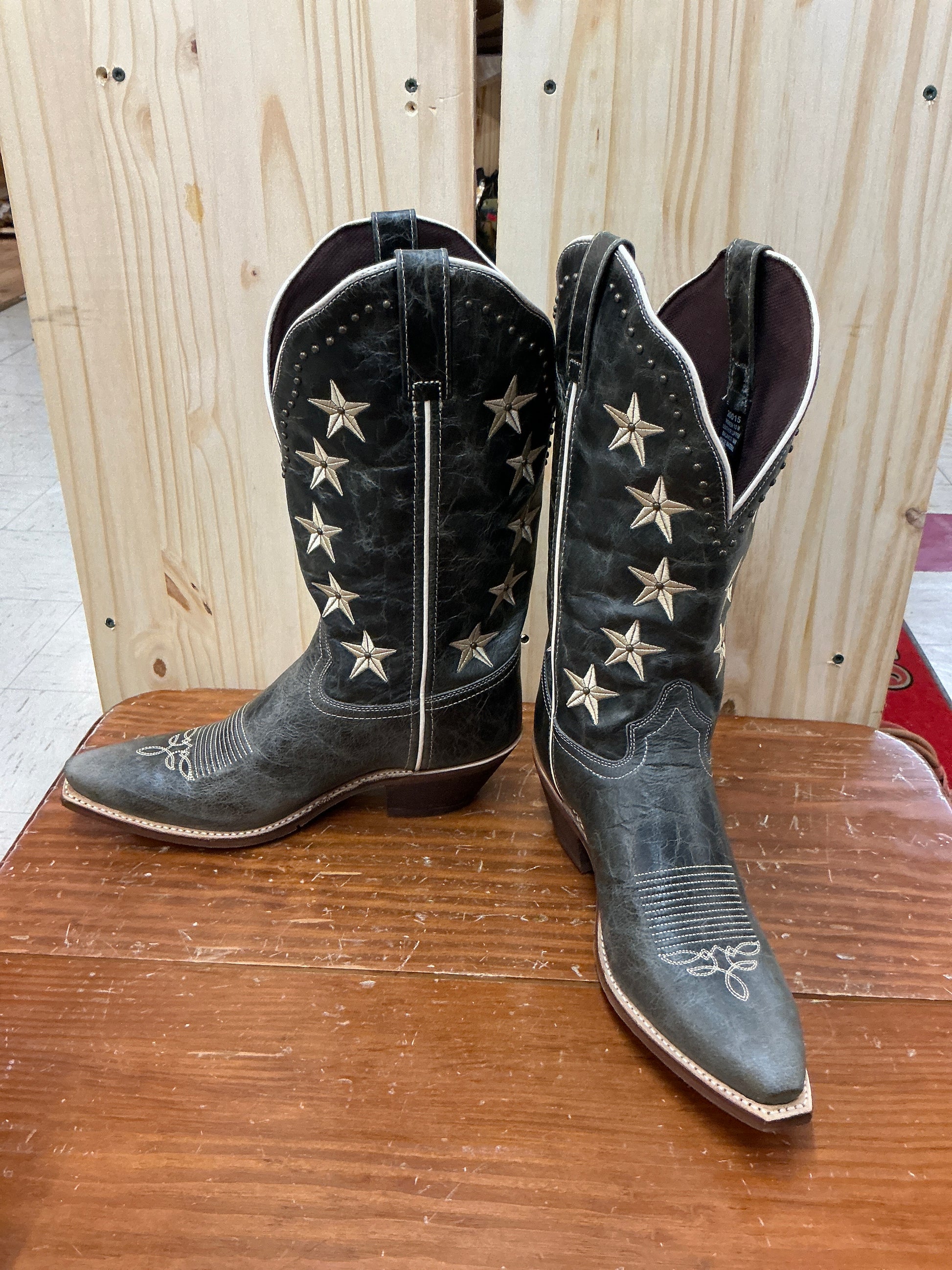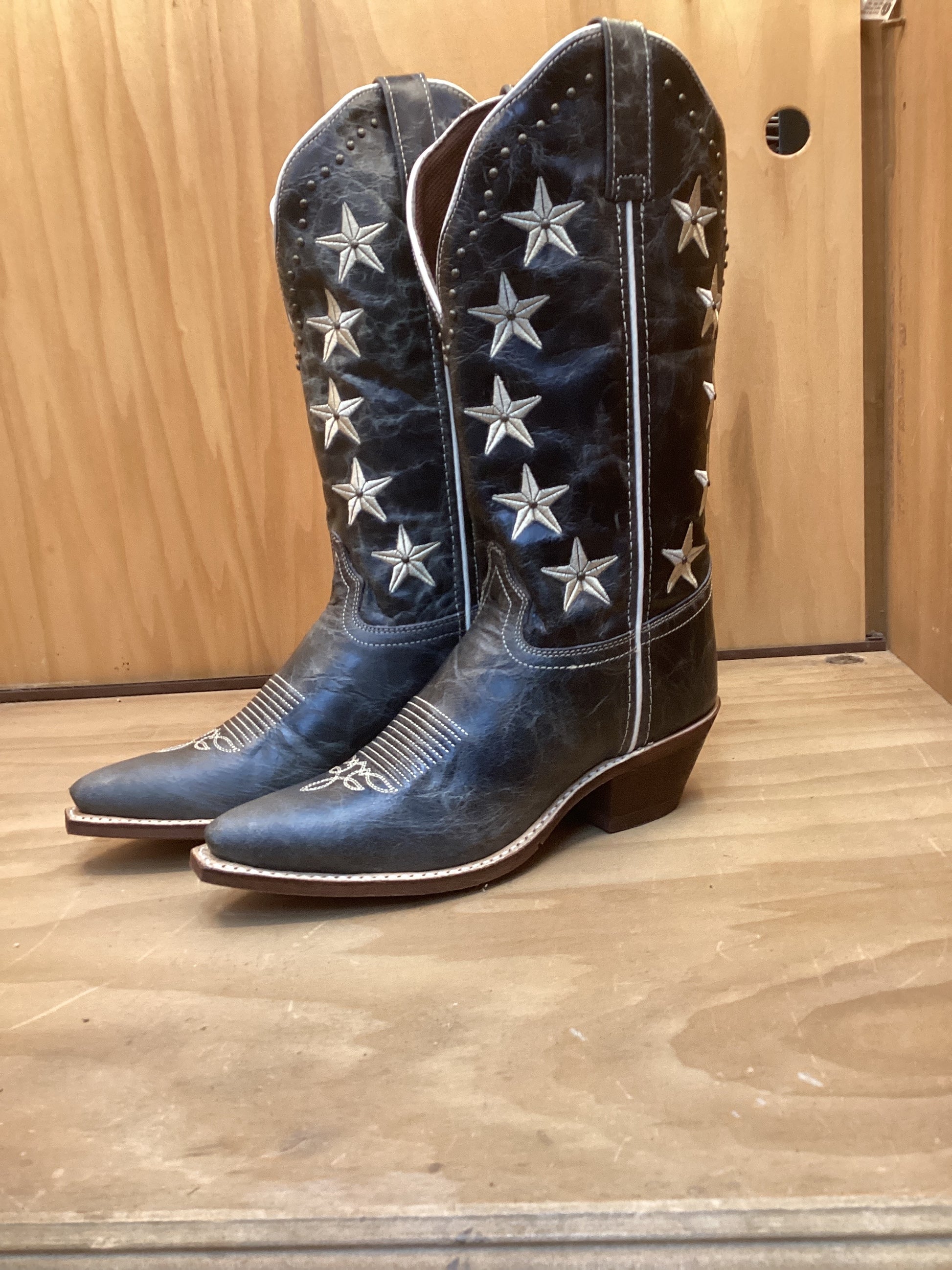 The stars weren’t just over Georgia, they are over your dancing feet with the Seranade boot.This all leather boot comes in a beautiful navy color with tan stars embroidered on the shaft. Designed for ladies needing a wide calf, the deep dip gives a flattering look when worn with shorts or skirts.