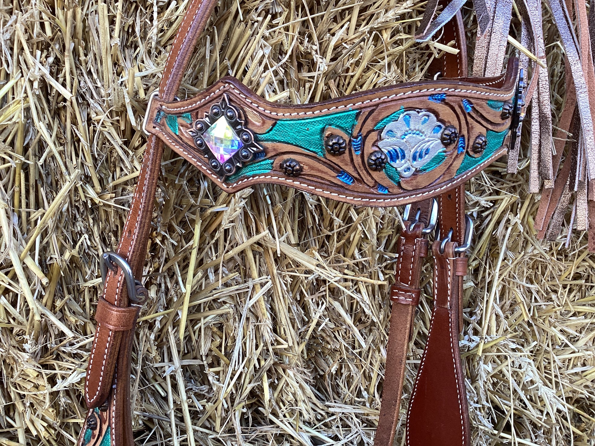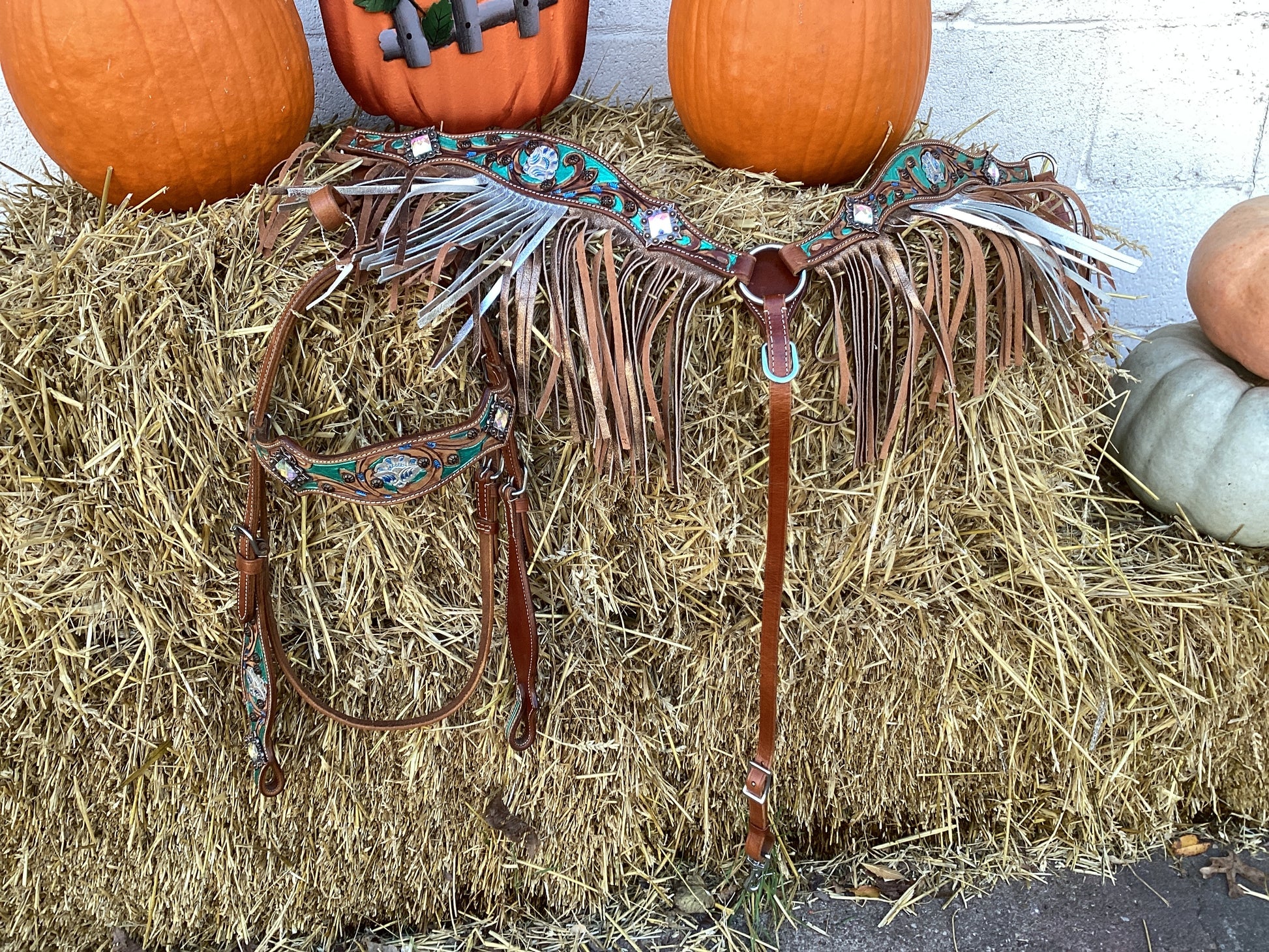 Made of quality leather with beautiful hand painted tooling, bling conchos, and copper and silver fringe, the Showstopper will look beautiful on any color horse!