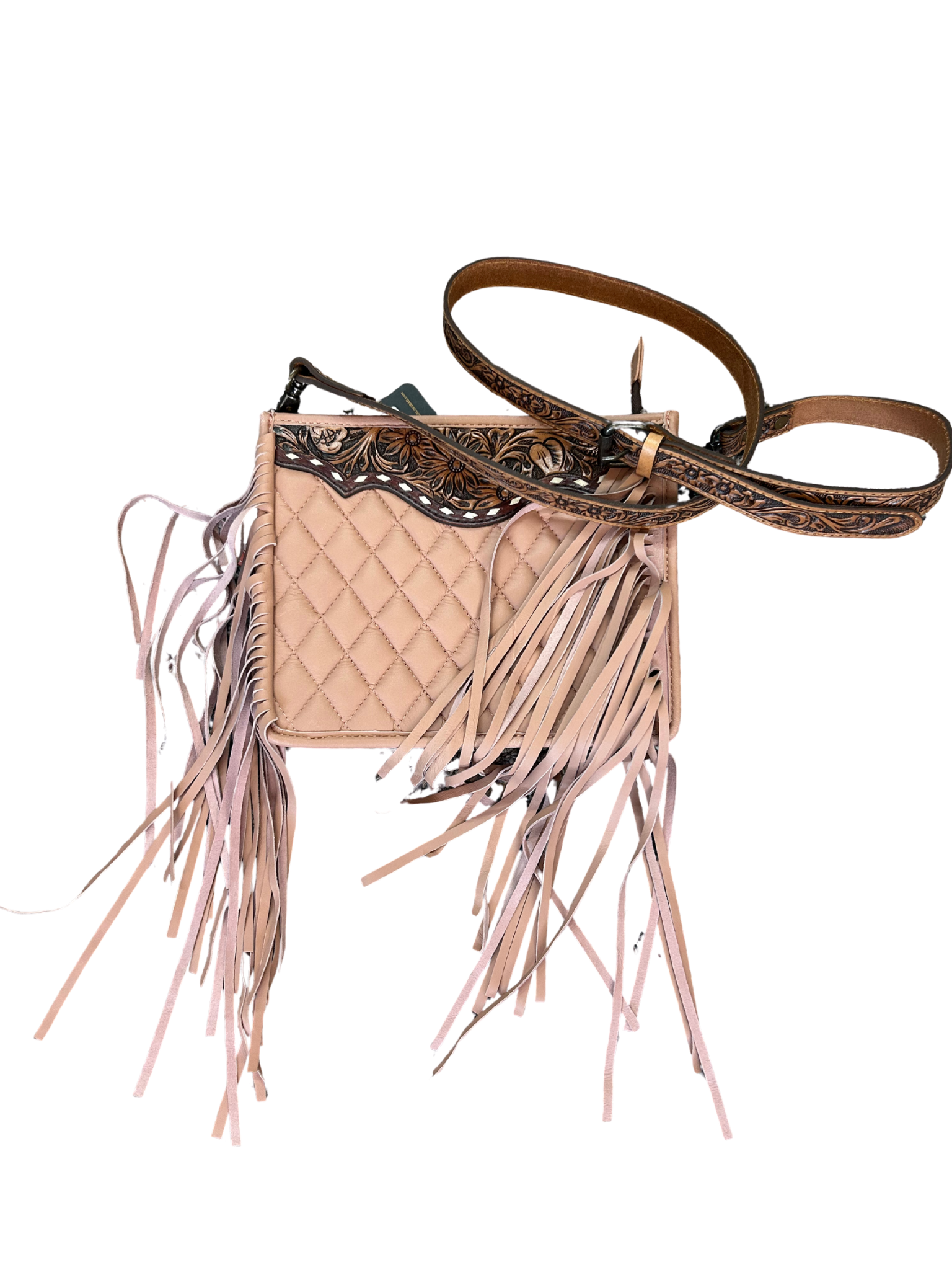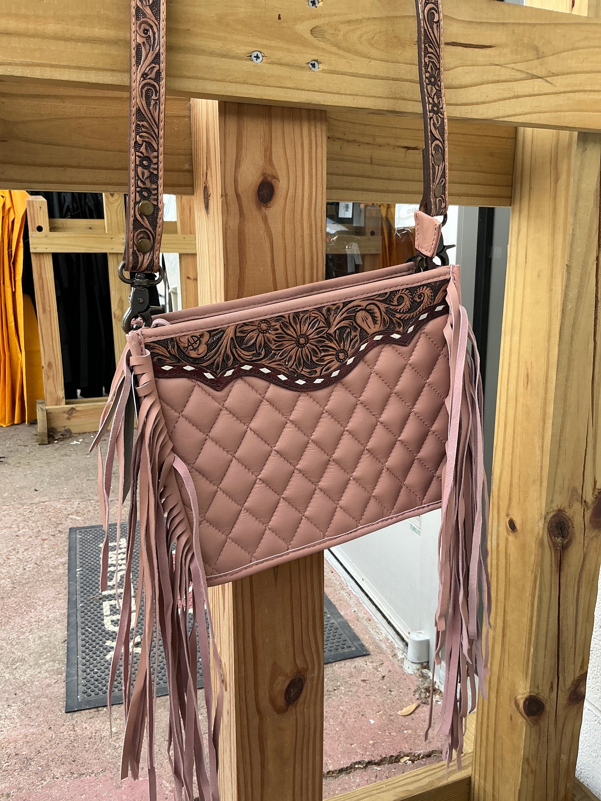 Blush pink purse with tooled leather, fringe, and buck stitch