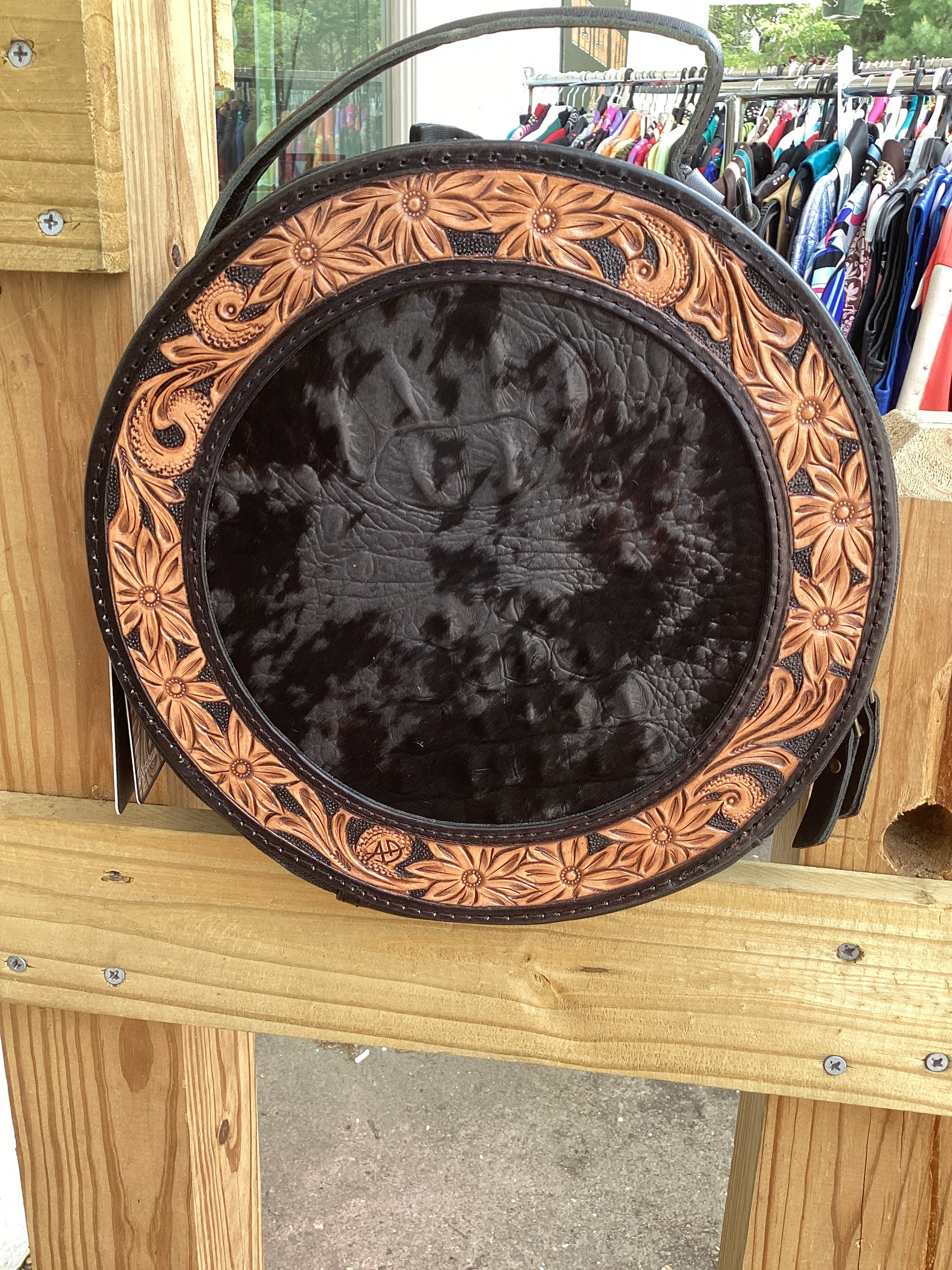 Styled after the old train cases of the past The Traveling Lady is big enough to carry it all but keep that cowgirl style. The floral tooling is the perfect contrast to the caiman center. Dual zip pockets keep your items separate while the handle and removable strap make it versatile.