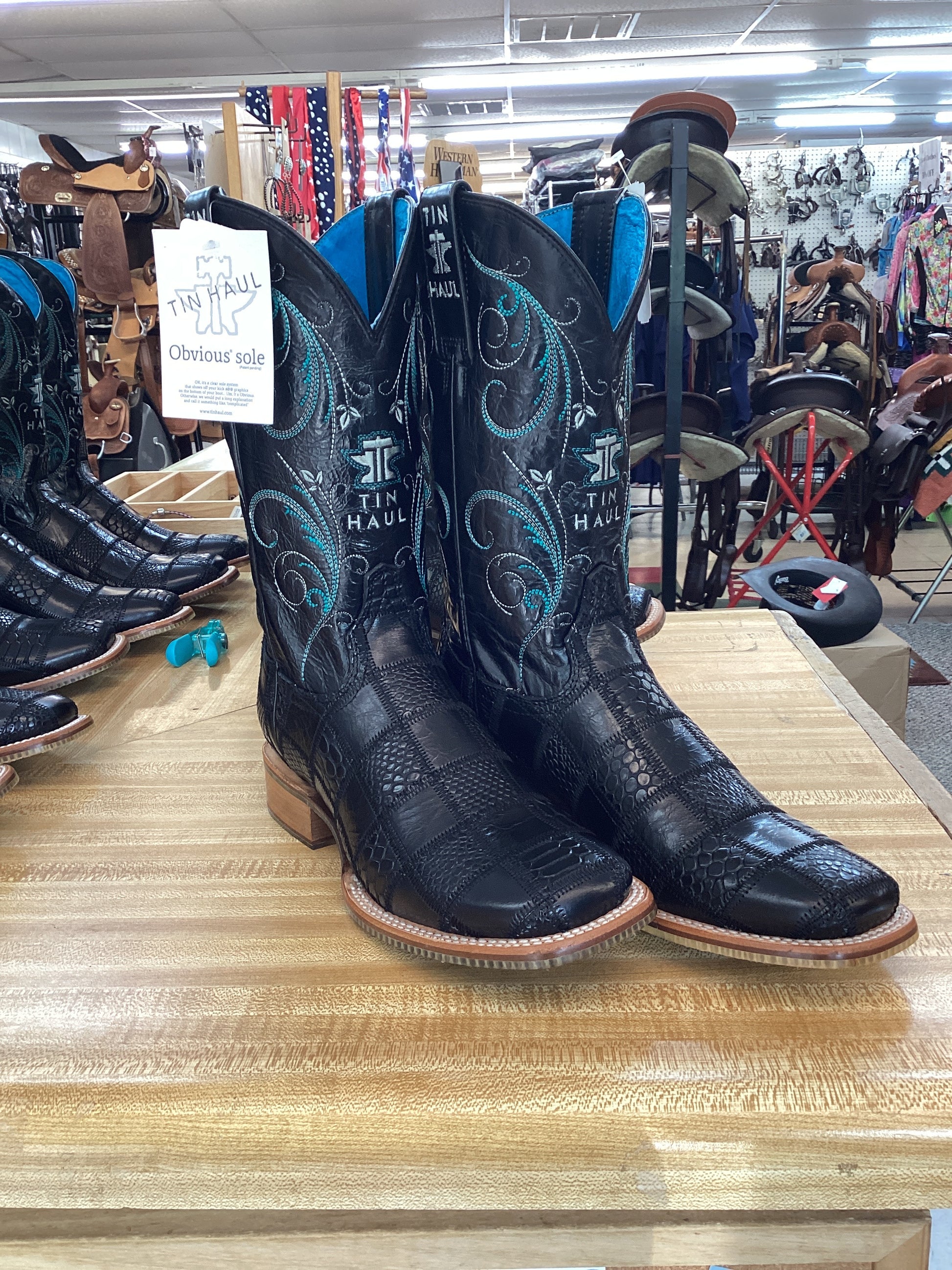 The beautiful Checker’d boot from Tin Haul features a checkered black Caiman foot with beautiful teal and white stitching on shaft. The iconic Tin Haul sole says it just right “I Can Be Bad, I Can Be Good” its up to you as to which one you get!