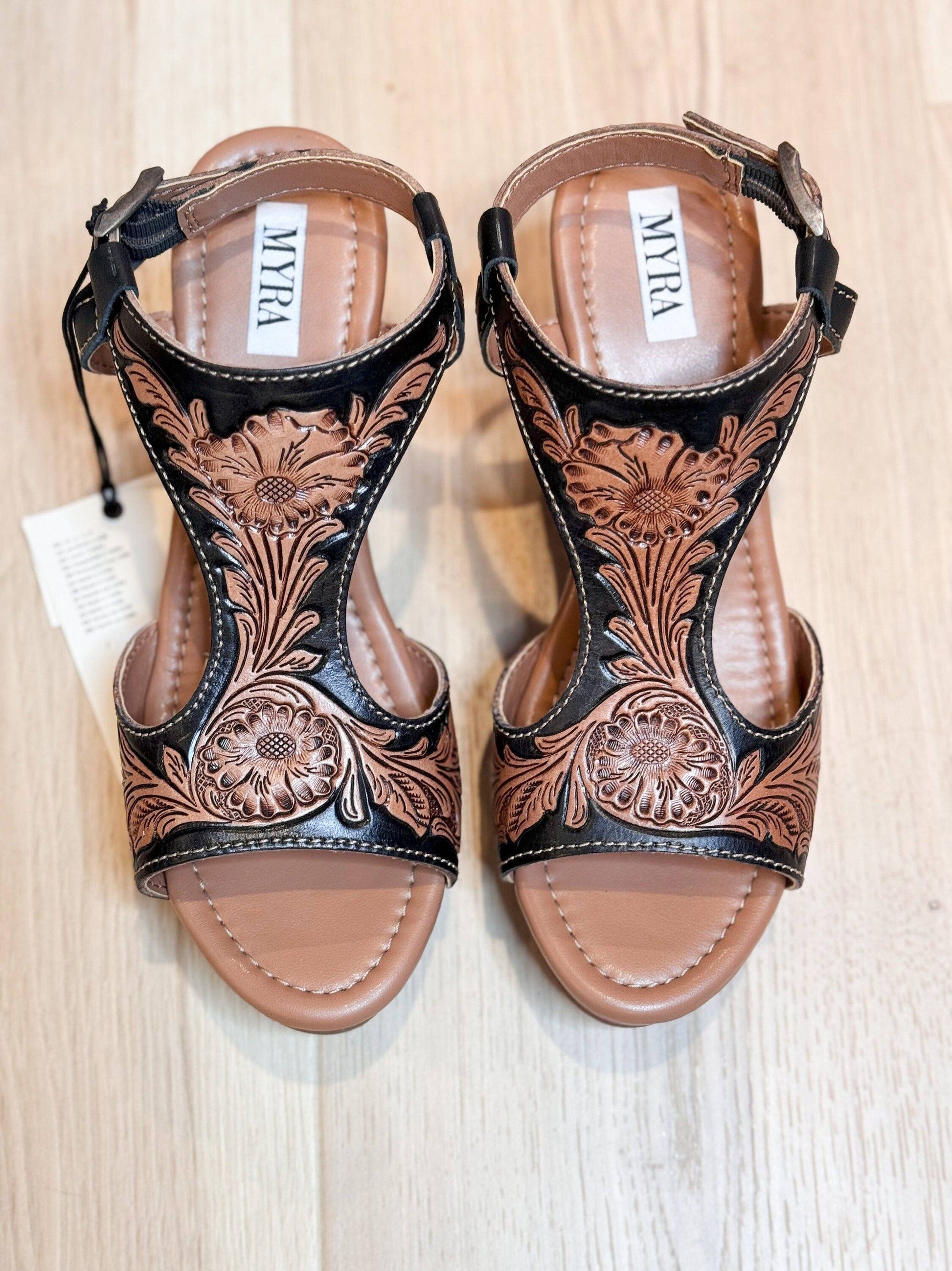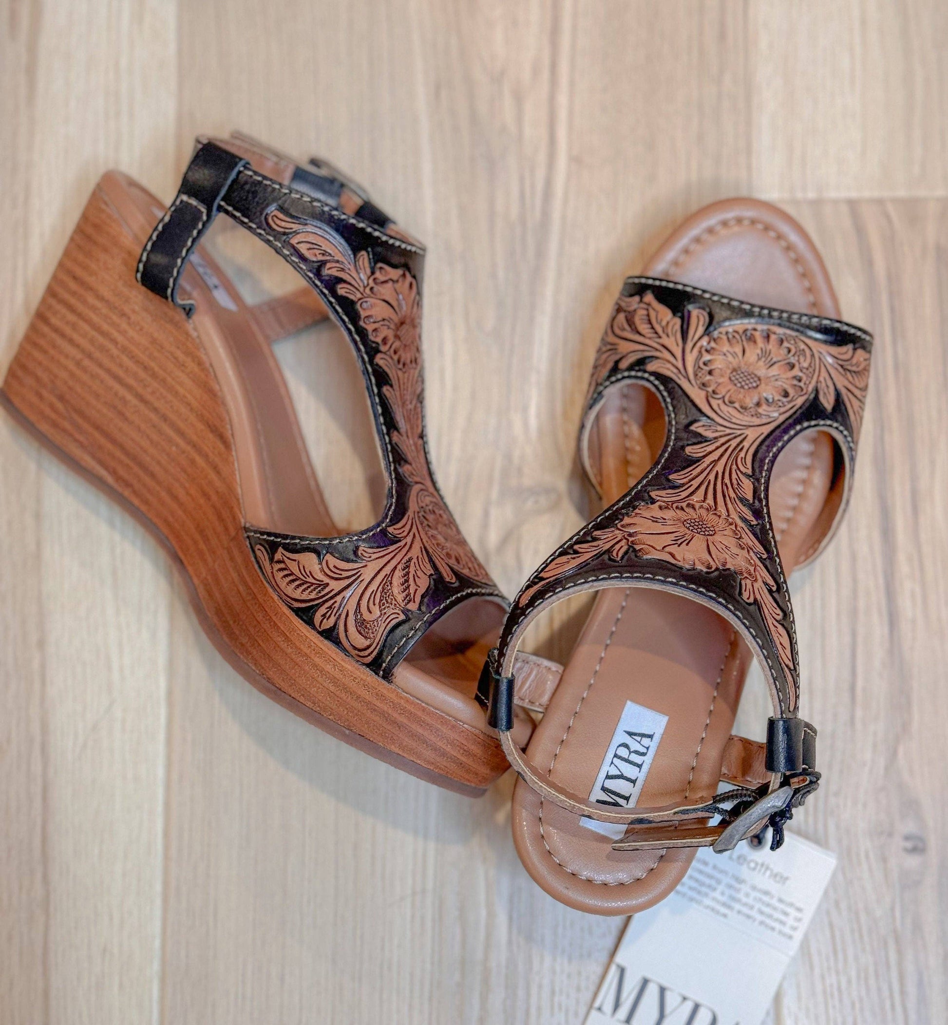 Gorgeous tooled leather wedge sandals perfect for any Cowgirl wardrobe!