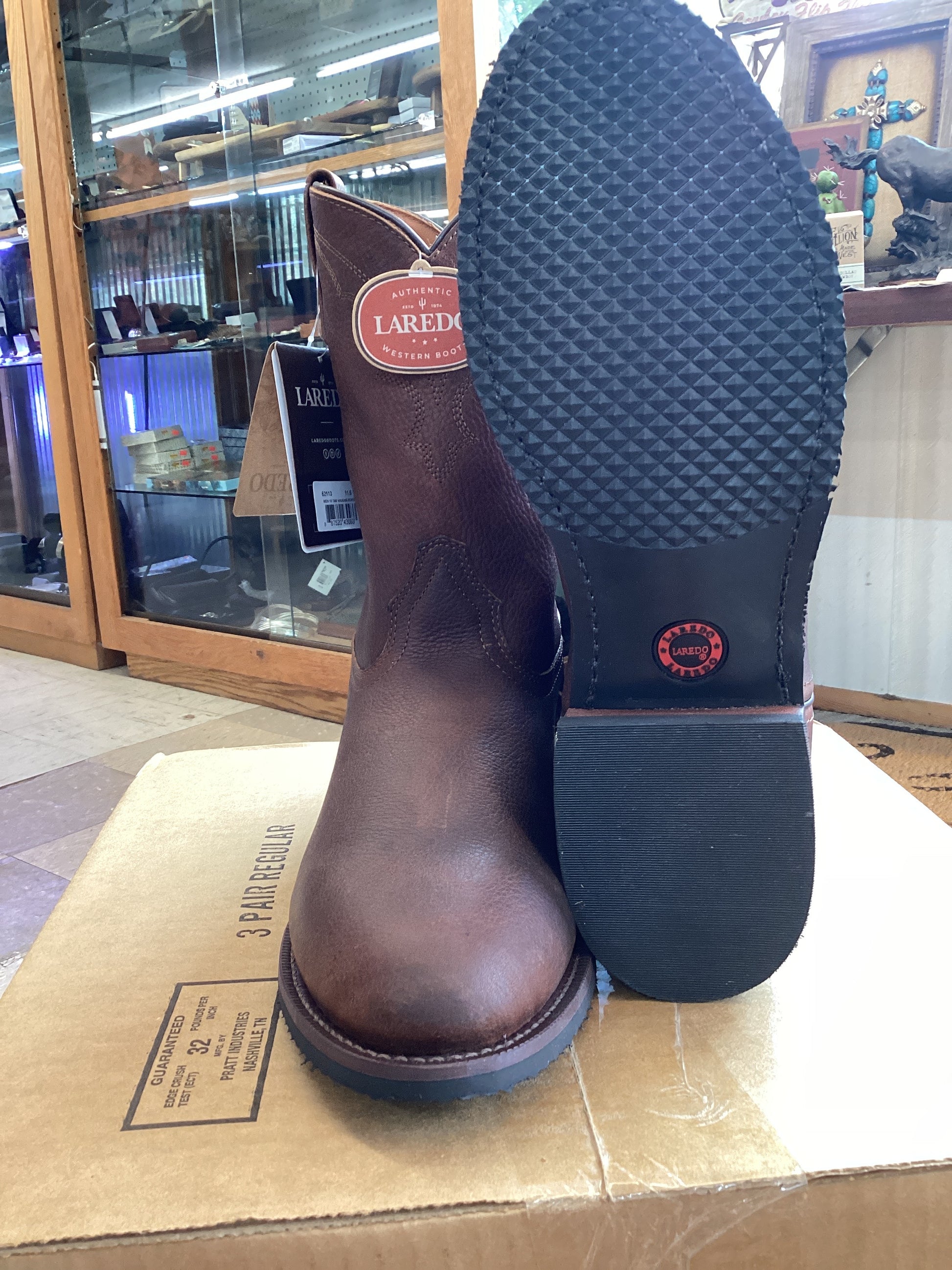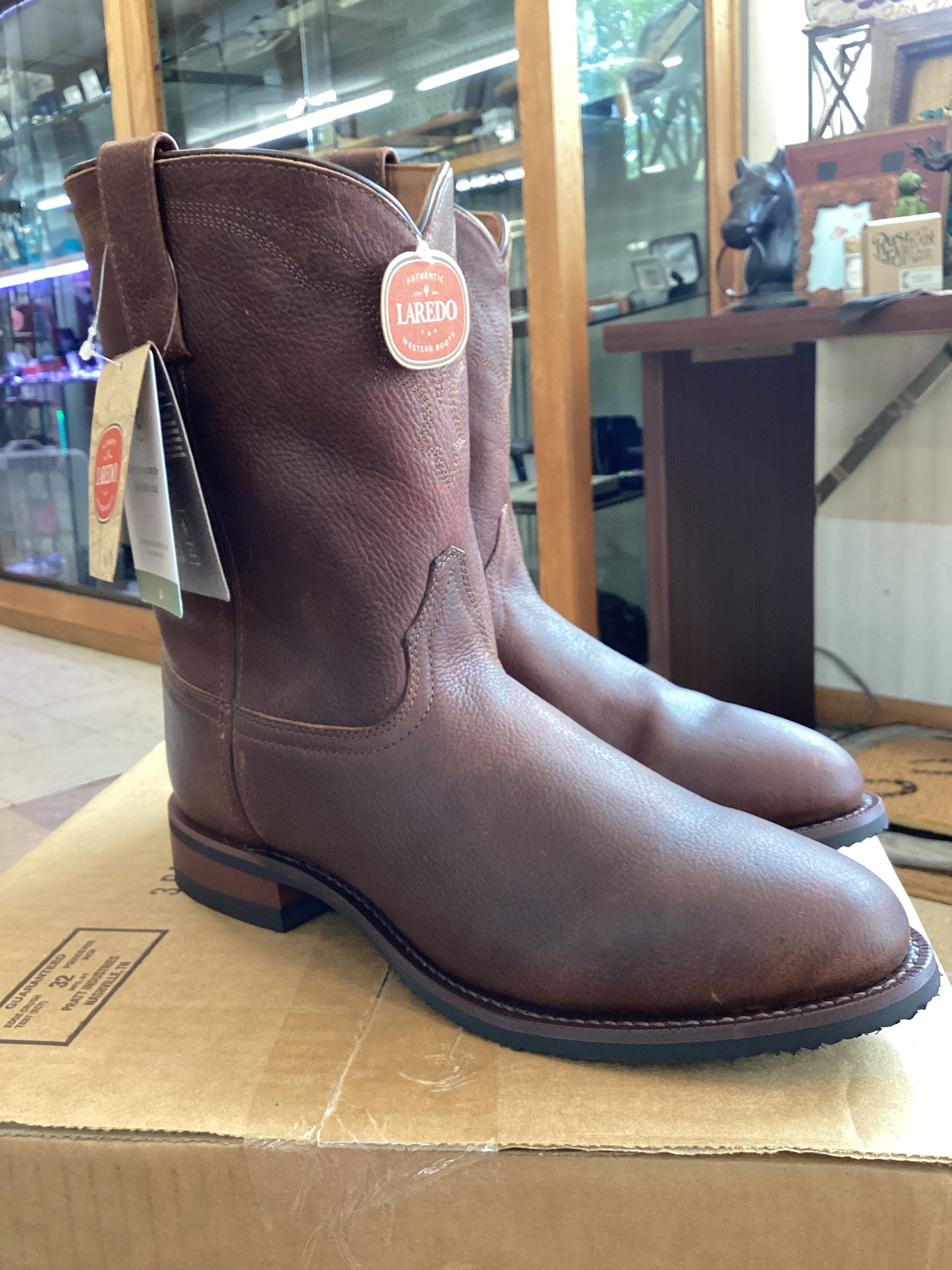 A throwback to the traditional cowboy boot with the roper toe and allover medium leather.